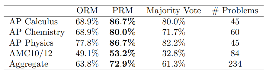- 결과: PRM(78.2%) > ORM(72.4%) > 다수결 방식(69.6%)