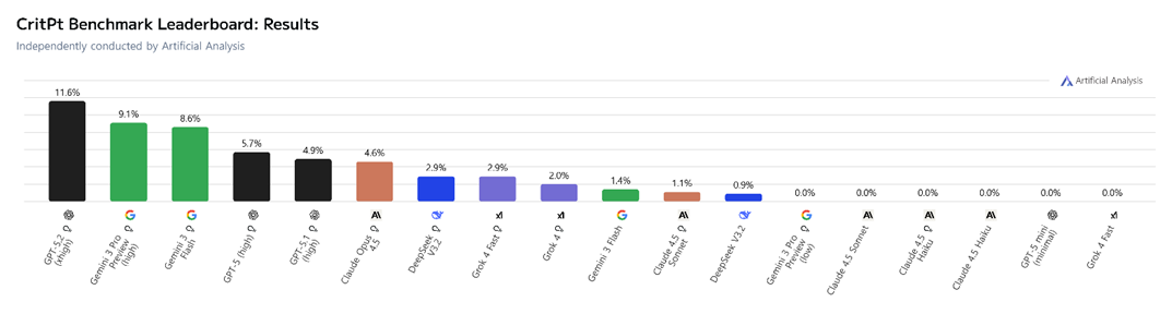 본 글에서는 Intelligence Index에 포함된 물리학 영역 벤치마크 중 하나인 CritPt에 초점을 맞추어 살펴보고자 한다. 차례대로 데이터셋의 필요성 및 의의와 설계 특징, 평가 방법론, 다양한 AI 모델의 성능 결과, 그리고 데이터셋의 한계점에 대해 다룰 예정이다.