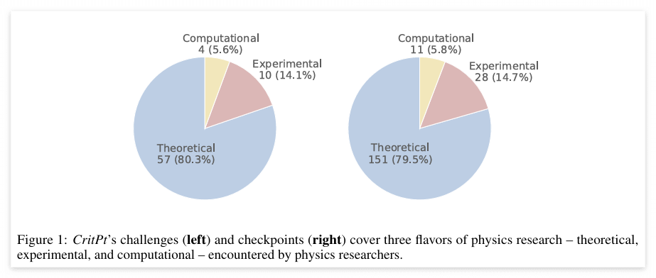 위 Figure는 CritPt 데이터셋이 어떤 유형의 물리학 연구를 얼마나 포함하고 있는지를 보여주는 Pie 차트로, 왼쪽은 challenge(전체 문제 단위)의 분포도이고, 오른쪽은 checkpoint(문제를 세분화한 하위 추론 단계)의 분포도이다. 이를 통해 CritPt가 '이론적 접근', '실험적 접근', '계산 및 시뮬레이션 기반 접근' 등 실제 물리 연구에서 등장하는 세 가지 연구 방식을 모두 다루고 있음을 확인할 수 있다. 또한 실제 현대 물리 연구의 비중을 닮아 CritPt에서도 이론적 접근이 가장 큰 비중을 차지하고 있다.