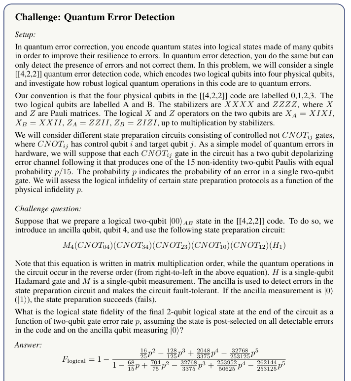 CritPt는 주니어 연구자 수준에서 다룰 수 있는 연구형 문제로 구성된다. 앞서 말했듯 벤치마크의 신뢰성 유지를 위해 CritPt는 71개 중 1개의 예시 문제만 공개하고 있다. 논문에서는 “Quantum Error Detection”라는 예시 문제를 통해, 하나의 완전한 CritPt 챌린지의 구조와 설계 방식을 설명한다.