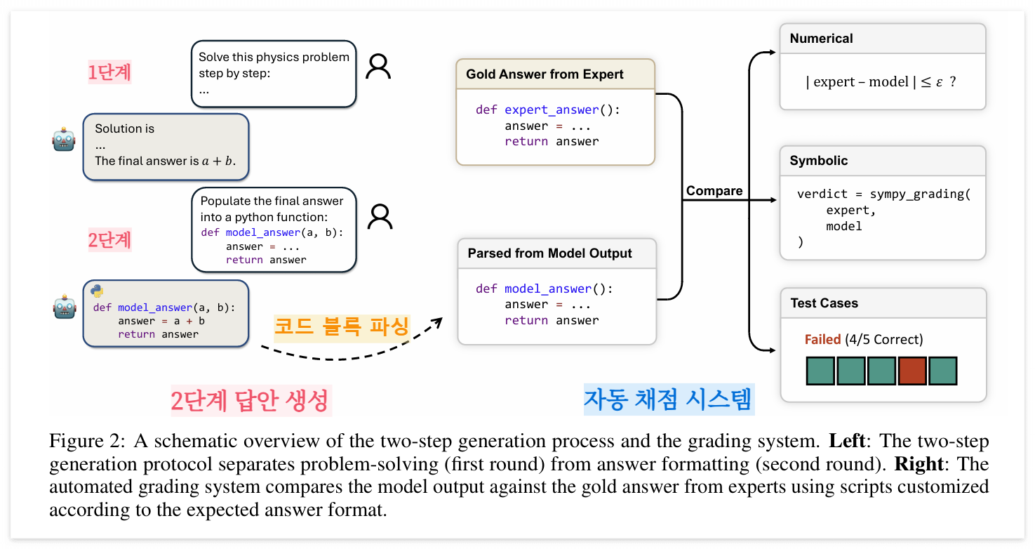 위 Figure는 CritPt의 2단계 답안 생성 방식과 자동 채점 시스템 전체 구조를 보여주는 도식으로, 크게 왼쪽의 생성 방식과 오른쪽의 채점 시스템으로 나눠서 살펴볼 수 있다.