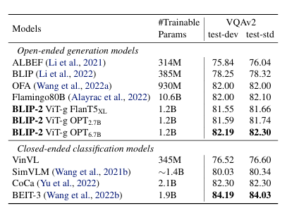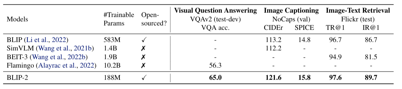- BLIP-2는 visual question answering(VQA), image captioning, image-text retrieval 등 다양한 vision-language 태스크에서 state-of-the-art 성능을 달성하였다. 특히 기존 대규모 모델 대비 훨씬 적은 trainable parameters만으로 경쟁력 있는 성능을 보이며, 계산 효율성과 확장성을 동시에 확보하였다.