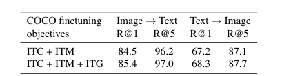 Image-Text Retrieval 성능 비교 (Flickr30K 및 COCO) - 또한 ITG(image-grounded text generation) loss가 retrieval 성능 향상에도 기여함을 확인하였다. 이는 representation learning 단계에서 queries가 language-informative visual features를 학습하도록 설계된 것이 타당함을 뒷받침한다.