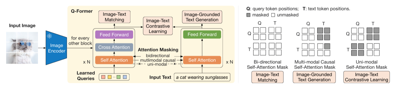 - Q-Former의 핵심 구성 요소는 32개의 learnable query embeddings이다. 이 쿼리들은 cross-attention을 통해 frozen image encoder의 고차원 출력과 상호작용하며, 텍스트와 가장 관련된 시각 표현을 선택적으로 추출한다.