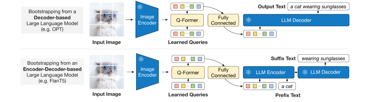 - Frozen image encoder로는 CLIP ViT-L/14와 EVA-CLIP ViT-g/14를 사용하며, frozen LLM으로는 decoder-based 모델인 OPT와 encoder-decoder 기반 모델인 FlanT5를 사용한다.