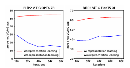 Zero-shot Visual Question Answering에서의 SOTA 비교 결과 - 또한 1단계 vision-language representation learning의 중요성도 실험적으로 확인되었다. 해당 단계를 제거할 경우 zero-shot VQA 성능이 크게 감소하며, 특히 OPT 기반 모델에서는 catastrophic forgetting 현상이 발생하였다.