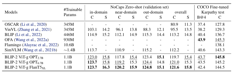 - COCO에서 fine-tuning을 수행한 결과, BLIP-2는 COCO test set뿐 아니라 out-of-domain 데이터셋인 NoCaps에서도 기존 방법 대비 향상된 성능을 보였다. 이는 frozen LLM을 유지한 상태에서도 Q-Former와 image encoder를 학습함으로써 강한 일반화 성능을 확보할 수 있음을 보여준다.