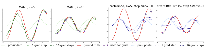 - 모든 Task (랜덤한 사인파) 에 대해 Pretrain한 모델에 대해 새로운 사인파의 K개의 Data Point를 제공하여 Fine-Tuning을 진행한 모델