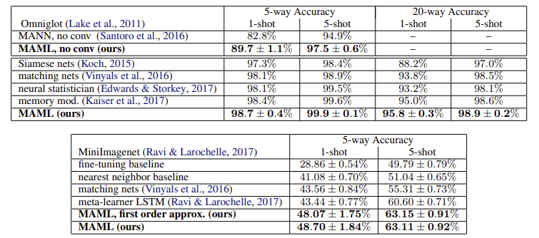- MAML 논문에서는 해당 분야를 MAML 관점으로 접근하고, 각 분야에 맞는 알고리즘을 제시하면서 MAML이 이 분야에도 잘 적용될 수 있음을 보여줌