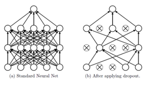 - (b)와 같이, 망에 있는 일부 뉴런을 생략(Drop Out)하고 줄어든 신경망을 통해 학습 수행