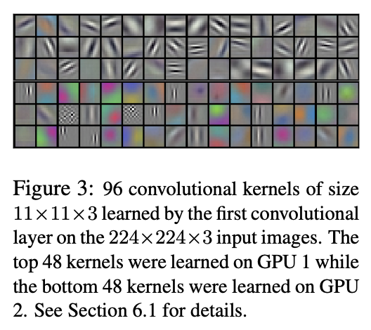 Figure 3은 네트워크의 두 데이터 연결 레이어가 학습한 컨볼루션 커널로, 224×224×3 입력 이미지에 대해 첫 번째 컨볼루션 레이어가 학습한 11×11×3 크기의 96개의 컨볼루션 커널이다. 위쪽 48개의 커널은 GPU 1에서 학습되었고, 아래쪽 48개의 커널은 GPU 2에서 학습되었다. 네트워크는 다양한 주파수 및 방향 선택 커널과 다양한 색상의 블롭을 학습했다. GPU 1의 커널은 대부분 color-agnostic하고, GPU 2의 커널은 대부분 color-specific하다. 이러한 종류의 전문화는 모든 실행 중에 발생하며 특정 무작위 가중치 초기화(GPU의 모듈러 번호 변경)와는 무관합니다.
