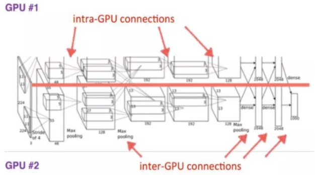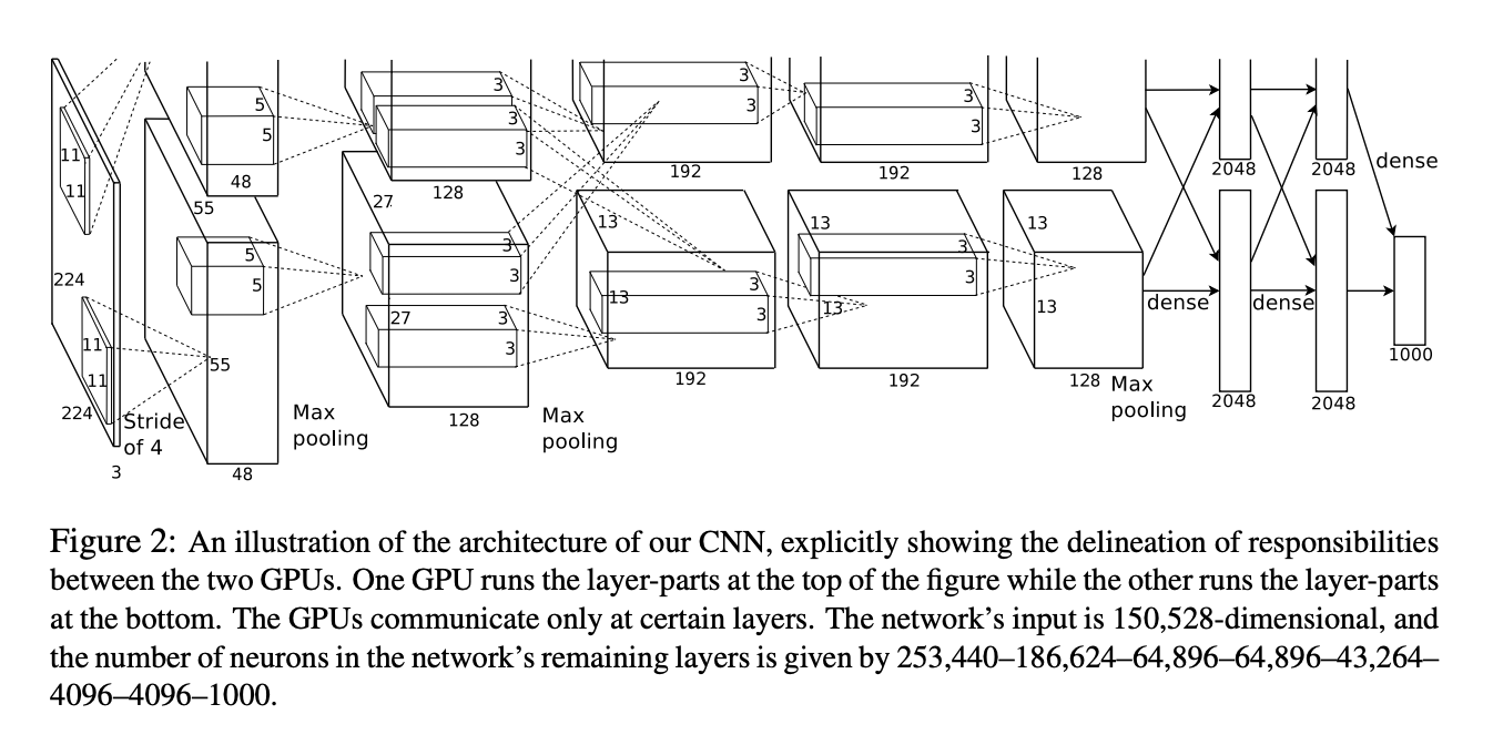 - 5개의 convolution layer(+max pooling)과 3개의 fully-connected layer, 1000 way softmax로 이루어짐
