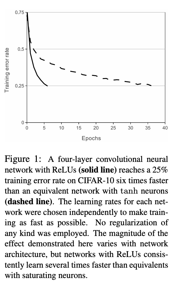 - ReLUs가 Tanh에 비해, 약 6배 빨리 수렴