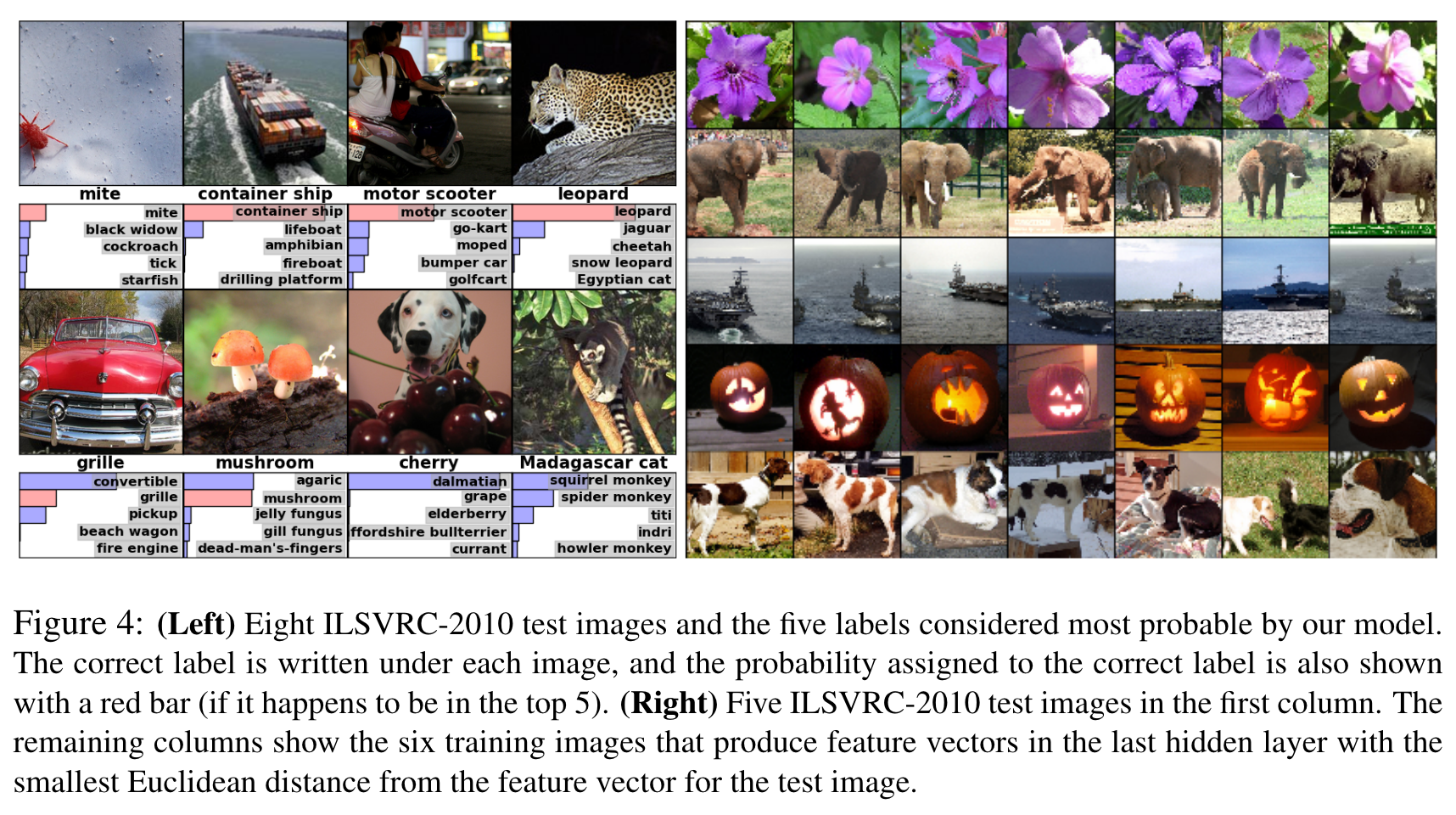 Figure 4에서, 왼쪽은 8개의 ILSVRC-2010 테스트 이미지와 모델에서 가장 가능성이 높은 것으로 간주되는 5개의 라벨로, 각 이미지 아래에 올바른 레이블이 표시되어 있으며, 정답 확률도 빨간색 막대로 표시했다(top-5 속하는 경우). 오른쪽은 첫 번째 열에 있는 5개의 ILSVRC-2010 테스트 이미지로, 나머지 열은 테스트 이미지의 특징 벡터와 유클리드 거리가 가장 작은 마지막 숨겨진 레이어에서 특징 벡터를 생성하는 6개의 훈련 이미지를 보여준다. 진드기처럼 중심에서 벗어난 물체도 네트워크에서 인식할 수 있음을 알 수 있다. 상위 5개 레이블의 대부분 그럴듯 하지만, 그릴과 체리는 사진의 의도된 초점이 모호한 경우도 있다.