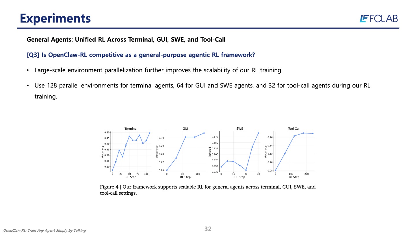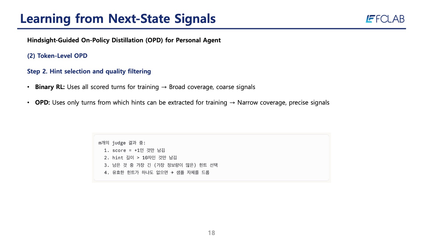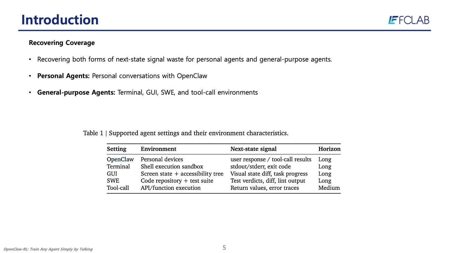 NLP [2026-1] 백승우 - OpenClaw-RL: Train Any Agent Simply by Talking BaekDaBang 2026. 3. 17. 20:57 OpenClaw-RL: Train Any Agent Simply by Talking Every agent interaction generates a next-state signal, namely the user reply, tool output, terminal or GUI state change that follows each action, yet no existing agentic RL system recovers it as a live, online learning source. We present OpenClaw-RL, a fra arxiv.org