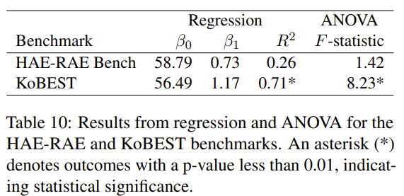 - ANOVA 분석을 통해 분석했고, KoBEST는 model size의 증가에 따라서 단순 성능 향상이 되지만, HAE-RAE Bench는 단순 model size 증가만으로는 해결되지 않음을 확인할 수 있음.