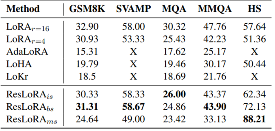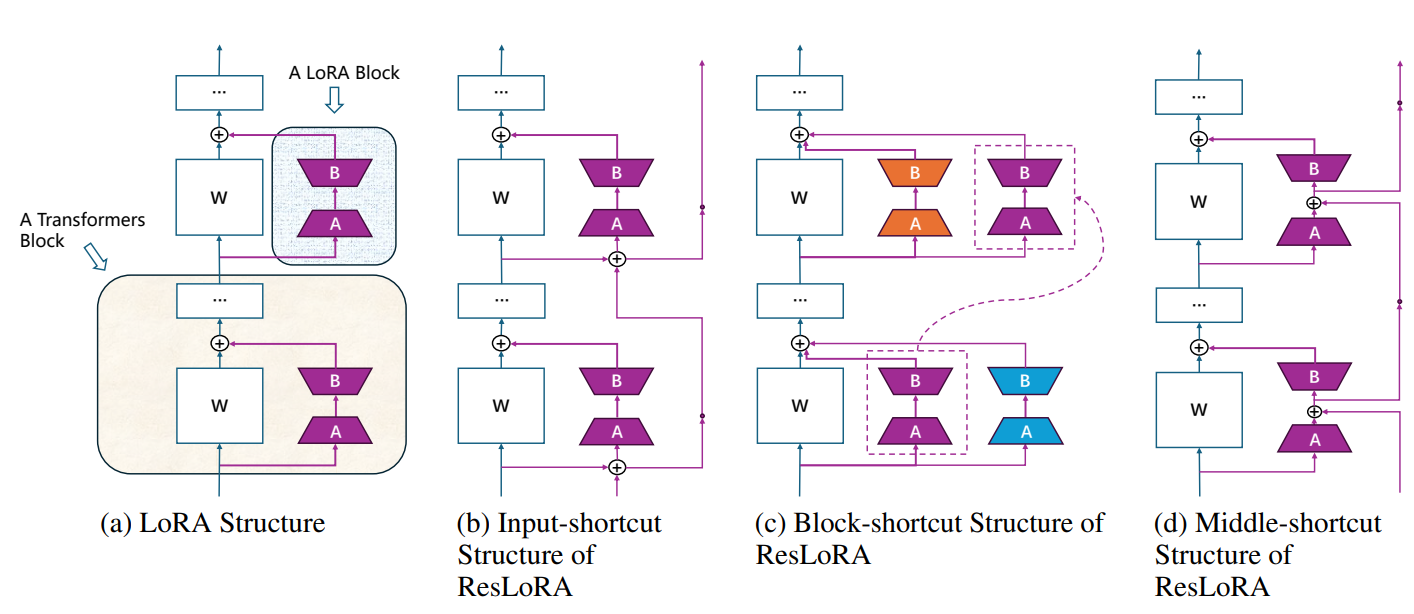 training에서의 LoRA 블록에 다양한 residual path를 추가하는 ResLoRA