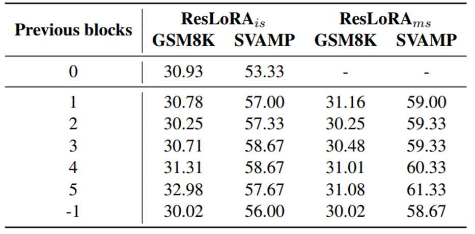 여기서 0은 앞의 걸 더하지않은 즉 일반 LORA를 의미하고, -1은 무한대로 더한 것을 의미함(모든 previous block 이용)