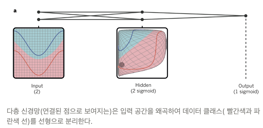 - 다층 신경망과(Multilayer neural networks)다층 신경망(연결된 점으로 보여지는)은 입력 공간을 왜곡하여 데이터 클래스( 빨간색과 파란색 선)를 선형으로 분리한다.
