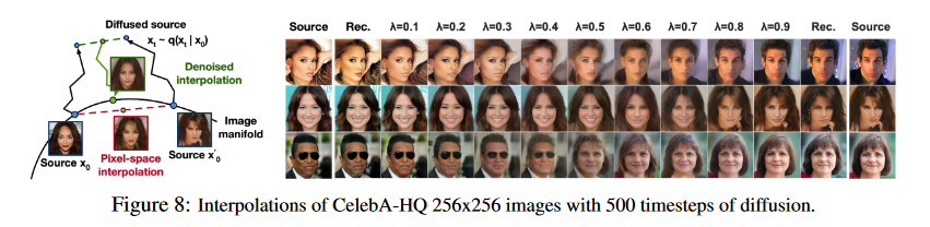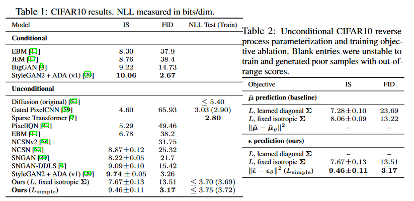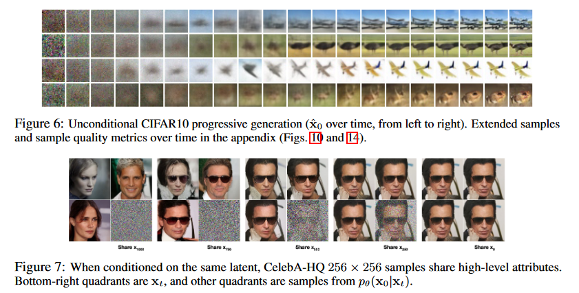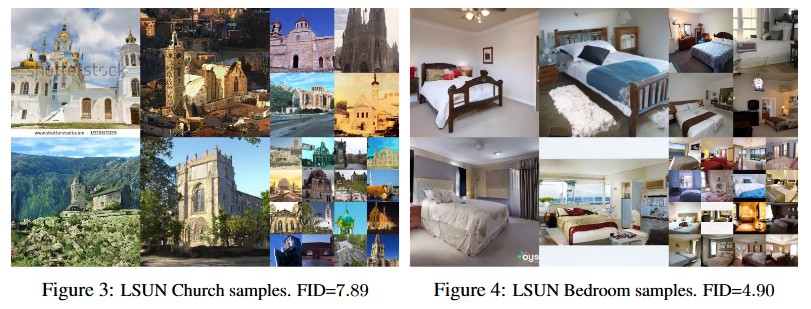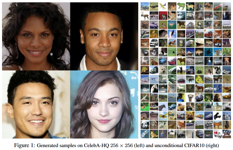 DDPM의 핵심은 reverse process의 $L_{t-1}$(noise)을 이미지의 형태로 다시 정의한 것에 있다. 이렇게 forward process와 reverse process를 정의하여 generative 모델을 구성하고, 이들로부터 사진 데이터를 만들어보면, 좋은 퀄리티의 사진을 만들어 냄을 알 수 있다.