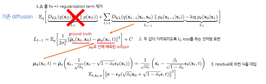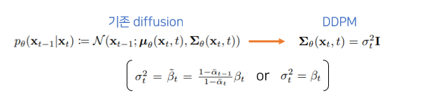 $\beta$를 상수로 가정했기 때문에, $\beta$에 영향을 받는 $p(x_{t-1}|x_t)$의 variance를 학습시키지 않아도 된다. 그렇기 때문에 variance term을 제거한다.