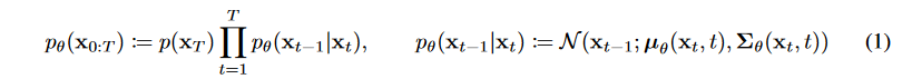 - $p_\theta (x_{t-1}|x_t) = N(x_{t-1};\mu _\theta (x_t,t),\sum{_\theta}(x_t,t))$