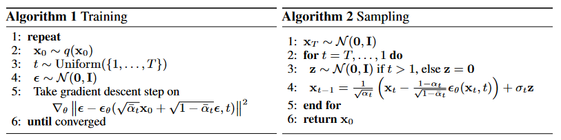 - Noise를 더해가는 과정, network($\epsilon _\theta , p_\theta$)가 $t$ step에서 noise($\epsilon$)가 얼마나 더해졌는지 학습
