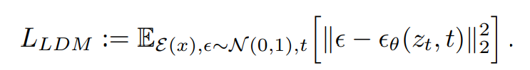 수식에서 L_LDM 은 LDM의 손실 함수를 나타냅니다. 이는 디노이징 단계에서 예측된 이미지와 실제 이미지 사이의 평균 제곱 오차(Mean Squared Error, MSE)를 최소화하는 것을 목표로 합니다. 수식은 다음과 같습니다: