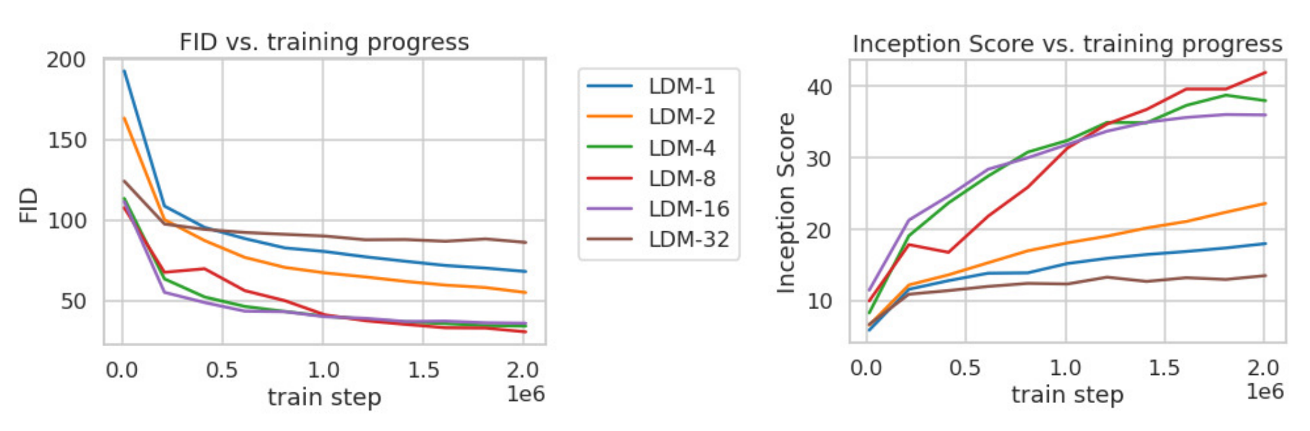 그래프 아래에 있는 이미지들은 LDM을 사용하여 압축 및 재구성한 이미지의 예를 보여줍니다. 이러한 이미지는 LDM이 어떻게 효과적인 압축을 달성하면서도 눈에 띄지 않는 세부 사항을 제거하여 이미지 품질을 유지하는지를 시각적으로 보여줍니다.