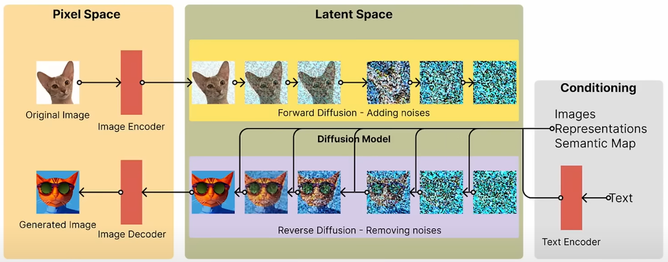 이 다이어그램과 수식은 LDM이 어떻게 이미지 생성 과정을 최적화하고 다양한 형태의 데이터에 대한 생성을 가능하게 하는지를 보여줍니다. 이러한 메커니즘은 특히 고해상도 이미지 생성과 관련된 작업에 있어 계산 비용을 크게 절감할 수 있는 효과적인 방법입니다.