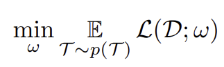- Meta-Learning은 task들에 대해서 genearlize를 하는 것이 목표임. "How to Learn"을 대변하는 파라미터 w는 task의 분포 p(T)에 의해서 평가될 수 있을 것임. Task는 Dataset D와 loss function L에 대해 T={D,L}로 정의될 수 있음. 그렇다면, "Learning how to learn"은 다음과 같이 정의될 수 있음.