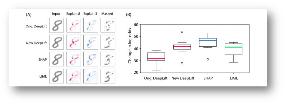 MNIST 숫자 데이터 세트에 대해 훈련된 컨볼루션 네트워크의 출력 설명했다. Original DeepLIFT에는 명시적인 Shapley 근사치가 없는 반면, New DeepLIFT는 Shapley Value를 더 잘 근사화하려고 노력했다.