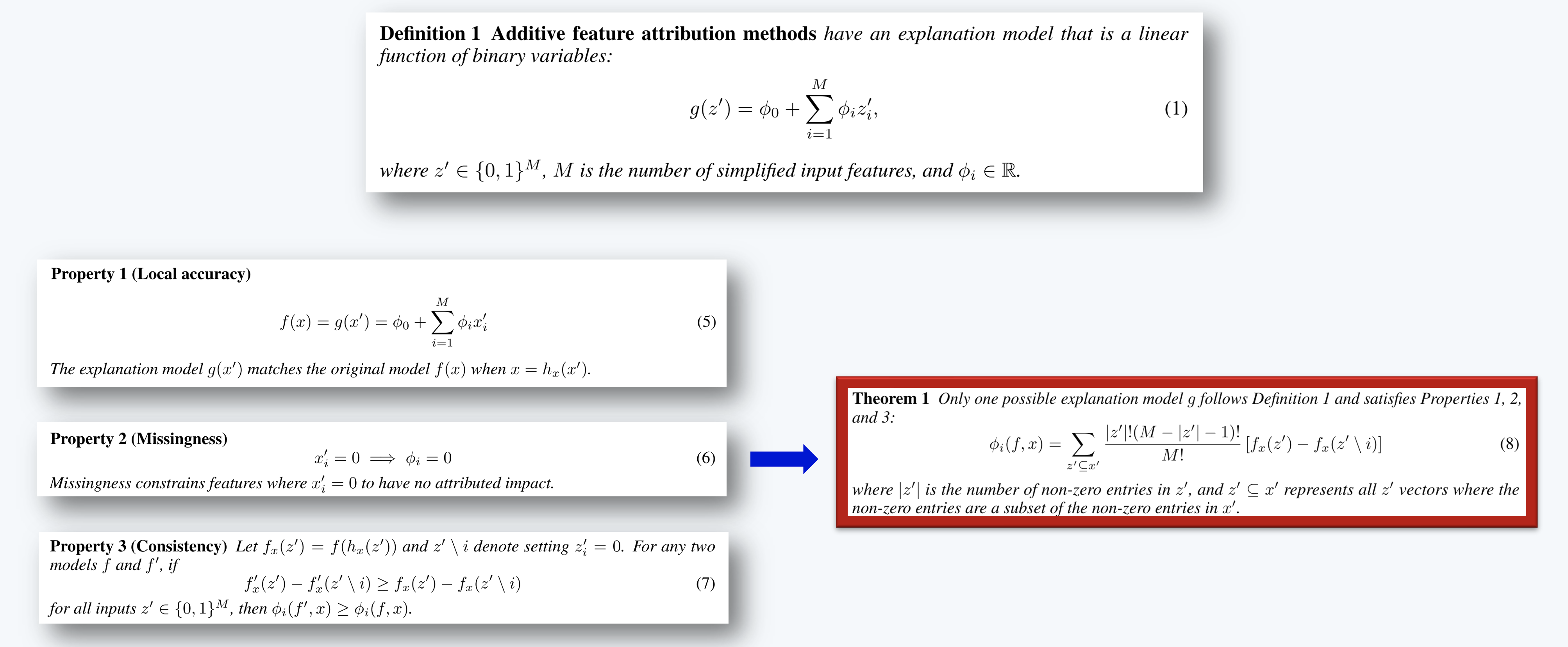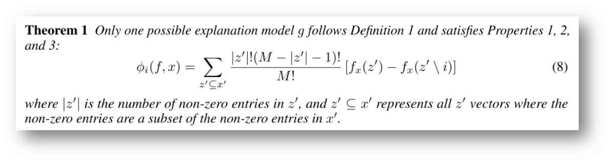 - Additive feature attribution methods에서 게임이론을 기반으로 하는 Shap Value가 유일한 해임을 밝힘.