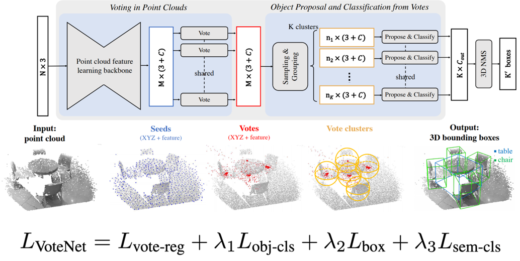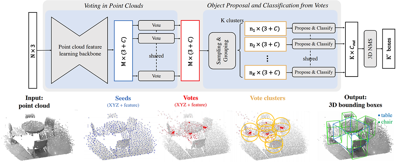 2D Hough Voting에서는 바운딩 박스를 찾기 위해 voting을 하는데 기여한 패치들을 back projection하는 과정이 필요했던 반면, 3D VoteNet에서는 clustering하여 찾아낸 cluster features를 aggregation하여 Pooling할 것인지 MLP를 통해서 학습을 하게 된다.