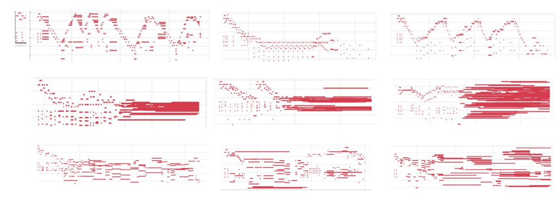 - 아래 그림(Figure 9)은 Relative attention을 적용한 Transformer와 Vanilla Transformer, 그리고 PerformanceRNN이 prime(음정, 화성음 등을 뜻함)을 어떻게 반복하고 있는지를 나타낸 그림이다. 확실히 Relative attention을 적용한 Transformer가 더 반복되면서 변화되는 구문을 생성하고 있음을 볼 수 있으며 Vanilla Transformer는 시퀀스 길이가 길어질수록 성능이 나빠지고 있음이 관찰된다. PerformanceRNN도 LSTM을 사용하기 때문에 시퀀스가 길어지니 성능이 하락한다.