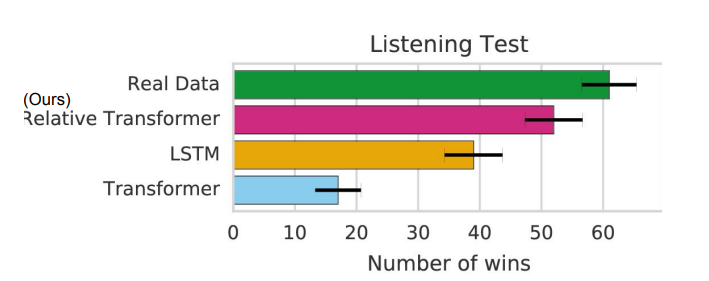 - Relative attention을 적용한 Transformer가 실제 원본 데이터만큼은 아니지만 그래도 기존의 다른 모델들보다는 더 좋은 성능을 보여주고 있음을 알 수 있다.