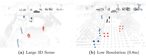 - Point-Voxel Convolution의 문제점: 큰 3D 장면을 처리할 때 작은 인스턴스(예: 보행자)는 몇 개의 폭셀 그리드에만 해당되어 유용한 정보를 학습하기 어렵습니다.