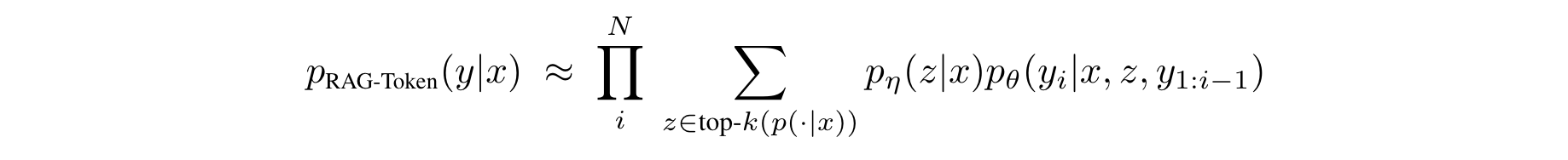 $(ii)$ 이전 $i - 1$번째 토큰 $y_{1:i-1}$, 원래 입력 $x$, 검색된 구절 $z$의 문맥을 기반으로 현재 토큰을 생성하는 $θ$로 파라미터화된 generator $p_θ(y_i|x, z, y_{1:i-1})$