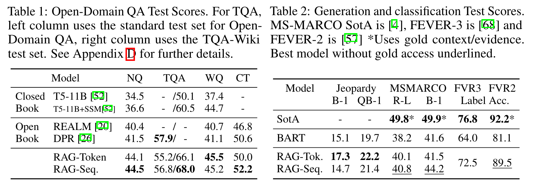 Fever라는 데이터셋은 자연어 claim에 대해서 위키피디아에서 적절한 문서를 가져와 해당 claim이 supported되는지, refuted되는지, 아니면 위키피디아에 충분한 정보가 없는지 판별하는 문제이다. 이 문제는 상당한 수준의 기계추론을 요구한다. 왜냐하면 1) claim에 대응하는 적절한 문서를 위키피디아에서 retrieve 해야 하고, 2) retrieve된 문서를 바탕으로 정확하게 claim에 대한 추론을 해야하기 때문이다. 저자들은 real-world에서는 어떤 claim이 주어졌을때 어떤 문서가 이와 관련 있는지에 대한 정보가 없기 때문에 retrieve 문서에 대한 supervise learning은 진행하지 않고, 학습을 진행했다. SOTA모델들은 FEVER을 위해 특화된 구조를 가지고 있지만, RAG는 범용성 높은 구조로 괄목할만한 성능을 보여주었습다.