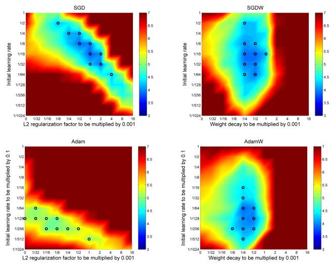 AdamW는 SGD와 Adam 모델에 L2 regularization과 Weight decay 개념을 적용한 알고리즘으로, Overfitting을 방지하는 목적으로 설계되었다. Weight decay란 이전 weight의 크기를 어느 정도 줄여서 반영하는 것을 의미하는데, 이는 L2 regularization을 적용하여 같은 효과를 낼 수 있다. 다만, Adam에 L2 regularization을 적용할 경우 weight decay 효과가 SGD의 경우보다 낮은 rate으로 적용되므로 generalization 능력이 비교적 떨어지는 것으로 볼 수 있다.
