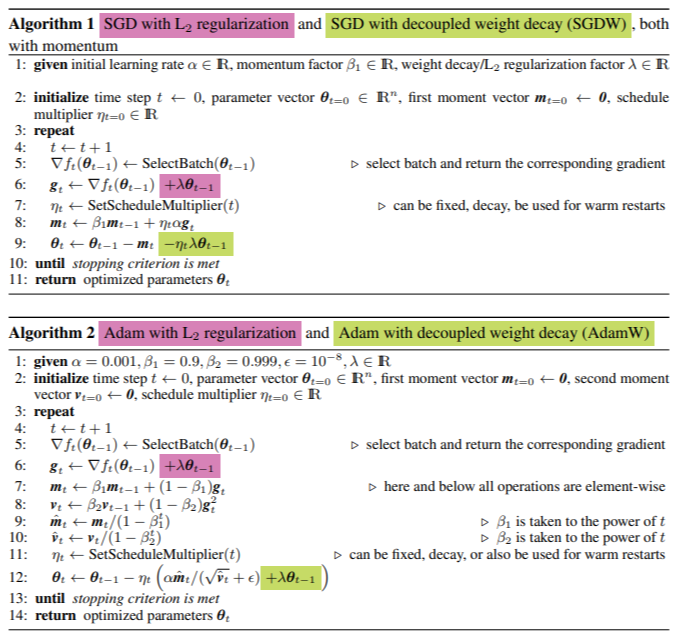$\theta_{t+1} = (1-\lambda)\theta_t - \alpha\triangledown f_t(\theta_t)$ (weight decay)