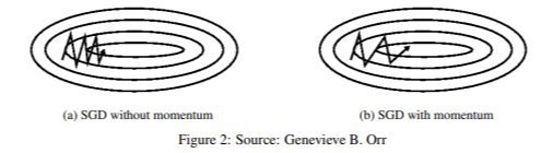 Momentum의 전 단계인 SGD (Stochastic gradient descent)는 minimum에 도달하기 위해 여러 번의 진동과정을 거쳐야 한다는 단점이 존재한다. 이를 극복하기 위해, Momentum은 '관성'이라는 개념을 추가하여, 현 단계에서의 Gradient가 전 단계에서의 Gradient와 같은 방향일 경우 가속, 반대 방향일 경우 감속하도록 조정하였다. 수식은 아래와 같다.