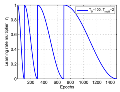 Gerneralization 능력을 더욱 향상하기 위해, 논문에서는 AdamWR이라는 알고리즘을 추가적으로 제시하고 있다. Learning rate을 의도적으로 조정하여 좋은 최적점에 도달하도록 하는 것을 learning rate annealing이라고 하는데, 보통은 learning rate을 지속적으로 감소하여 설계하는 것이 일반적이나 AdamWR에서는 중간중간 learning rate을 증가시키는 모습을 보여주었다(Warm restart). 이는 비교적 가파르게 변하는 local minimum에서 최적점이 형성될 확률을 낮추므로, 각 data별 generalized된 test loss를 얻기에 적합하다. 쉽게 말해, 학습데이터별로 서로 다르게 측정되는 예측치가 비교적 균등하게 출력된다는 것이다.