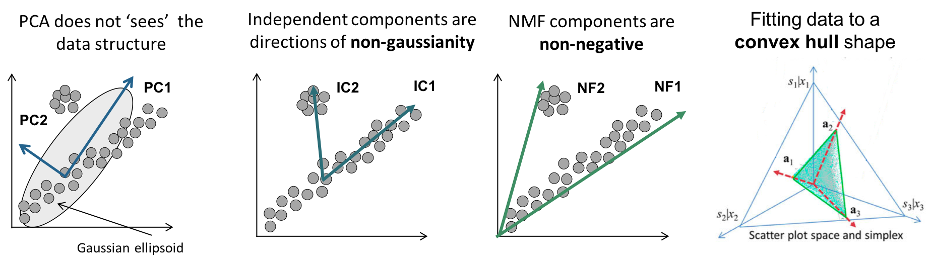 MF에서는 NMF가 있는데 이는 음수를 포함하지 않는 행렬의 행렬분해를 말합니다. 원본 행렬의 값들이 모두 양수면, 간단하게 행렬이 분해될 수 있습니다. 양수일 때 만 쓸 수 있는 제약조건이 있는데 데이터가 모두 양수일때 PCA와 SVD보다 NMF가 더 잘 축소를 시킨다고 합니다.