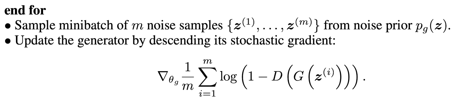 1. D 학습을 위해 (노이즈로부터 G를 통해 생성한 데이터 샘플링 → 실제 데이터 샘플링 → D 업데이트) 과정을 k번 반복
