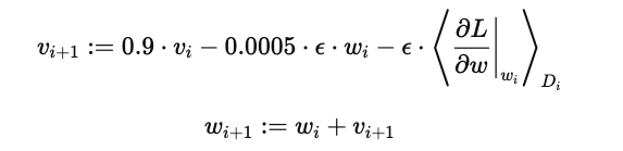 - 모멘텀 반영\( (0.9⋅v_{i}) \) : 이전 단계에서 모멘텀 변수 \(v_i\)를 90% 반영하여 현재 단계의 변화량에 영향을 미친다. 이는 학습 속도를 안정화하고 진동을 줄이는 데 기여한다.