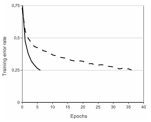 2. 학습 속도 향상: 네트워크가 빠르게 수렴하며, 이는 아래 그래프에서 확인할 수 있다. ReLU를 사용한 경우(solid line)는 tanh를 사용한 경우(dashed line)에 비해 훨씬 빠르게 수렴한다.