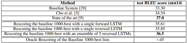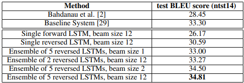 - WMT'14 영어-프랑스어 번역 작업에서, 5개의 딥 LSTM 앙상블(각각 3억 8천만 개의 매개변수)을 사용하여 간단한 좌에서 우로 진행하는 빔 서치 디코더로 번역을 직접 생성해 BLEU 점수 34.81을 얻었다.(재채점시 36.5)