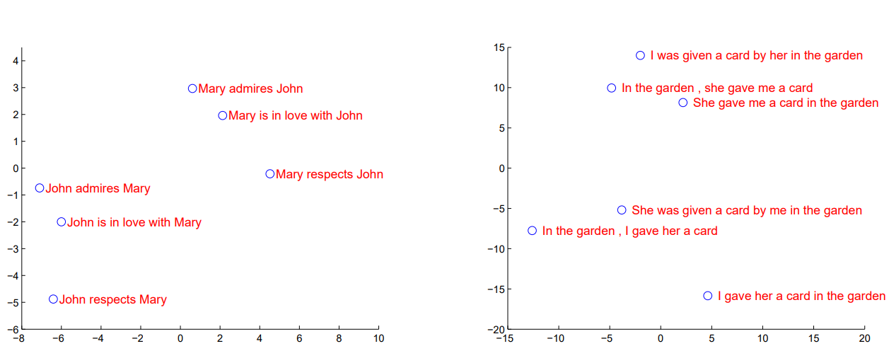 - 위의 그림은 문장을 고정된 차원의 벡터로 변환 후 2차원으로 PCA를 통해 축소하여 시각화했습니다. PCA를 통해 의미가 유사한 문장의 경우 모여있는 것을 볼 수 있습니다.